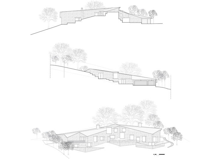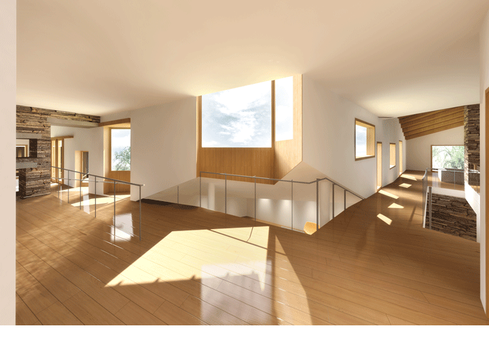 The Fahmy House is designed for a site that is so exceedingly steep and populated by native oak trees as to be almost impossible to build on. The primary goal of the project is to minimize the environmental impact of new construction while providing accessible and integrated interior and exterior spaces. Designed in accordance with the Hillside Development Standards and Guidelines for the town of Los Gatos, California, the design preserves the existing natural setting to the greatest extent possible. The massing of the house and its earthen materials, hues and tones are compatible with the surrounding landscape. From the street, visitors will see from the top of the hill, the roof line sloping parallel to the topography. The house shifts from level to level as it descends the hill. Oriented to mutually protect the house and its neighbors from intrusive interior night lighting, the house affords optimal views and privacy for its occupants and neighbors alike.